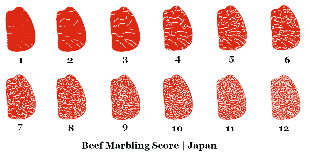 Auch haben die Japaner für die Klassifizierung für das Fett ihrer Rinder eine eigens dafür entwickelte Mess-Skala im Gebrauch, den sogenannten Beef Marbling Score, der eine Einteilung mit Qualitäts-Stufen von 1-12 hat. Die europäische Standard-Klassifizierung für Fett bei Rindern sieht hingegen nur die Einteilung von 1-5 vor.